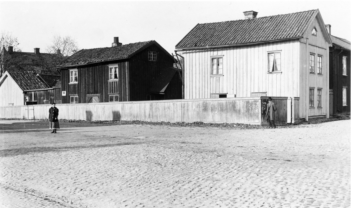 Kvarteret Almen i Karlstad: Hörnet Drottninggatan–Fredsgatan i slutet på 1800-talet. Bagare Roos hus närmast.