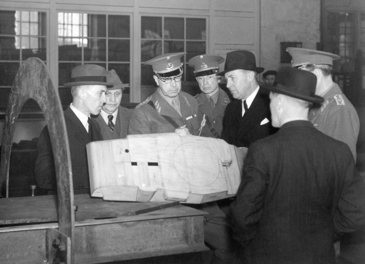 Gustav VI Adolf inspekterar en stridsvagnsmodell vid ett besök hos KMV i Karlstad. Företaget tillverkade 100-tals stridsfordon under beredskapen.