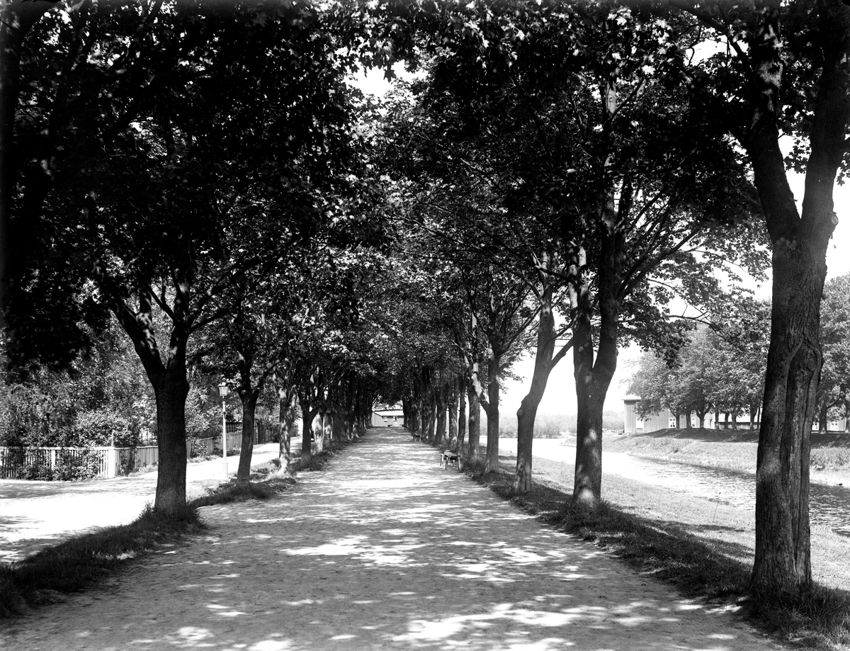 Allén längs pråmkanalens västra sida på en bild tagen runt förra sekelskiftet. Till vänster skymtar korsningen med Herrgårdsgatan.
