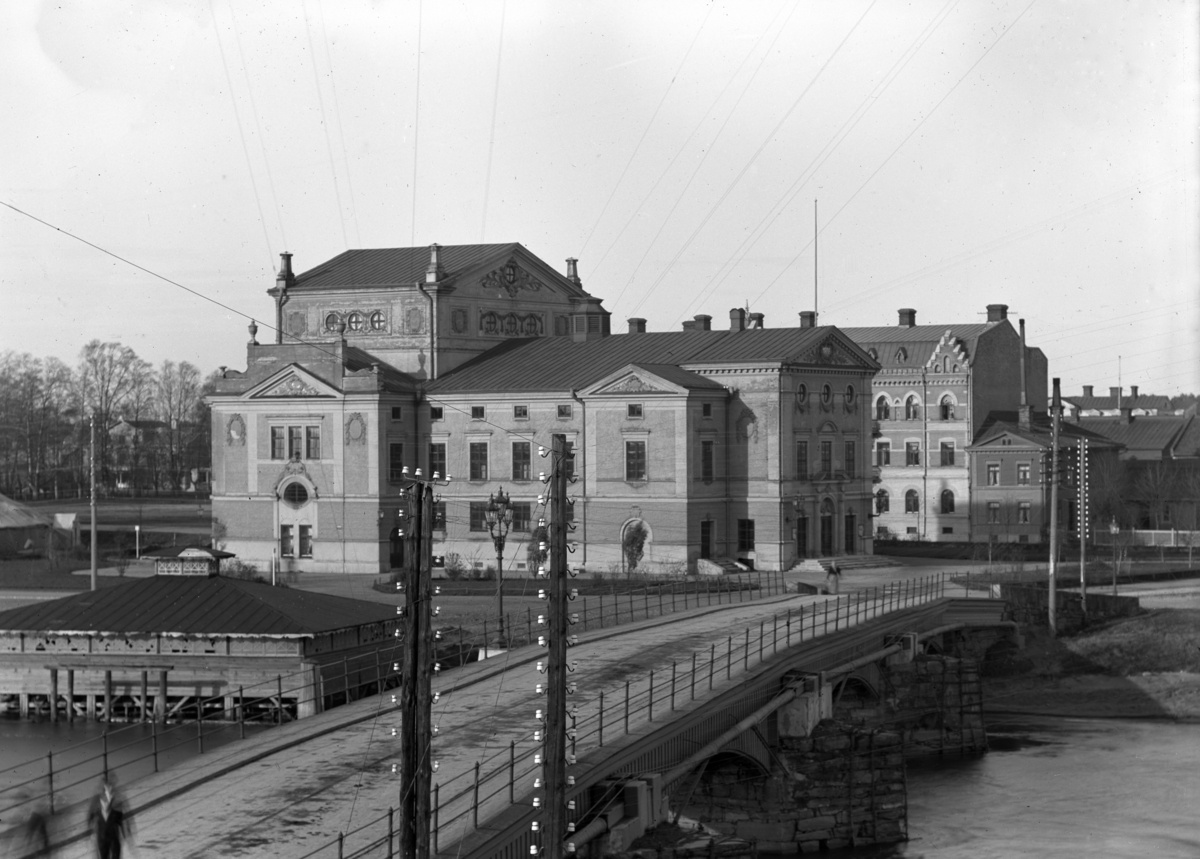 Västra bron och Teatern på en bild från 1898. Till vänster bykhuset, även kallat "klappbryggan", som revs 1903.