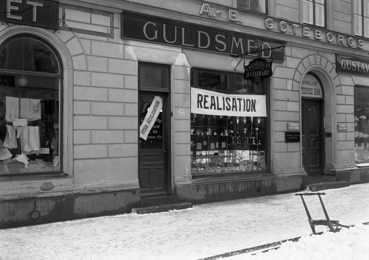Westerlunds guld rear. Butiken låg i den dåvarande nordvästra fastigheten i hörnet Drottninggatan–Västra Torggatan.