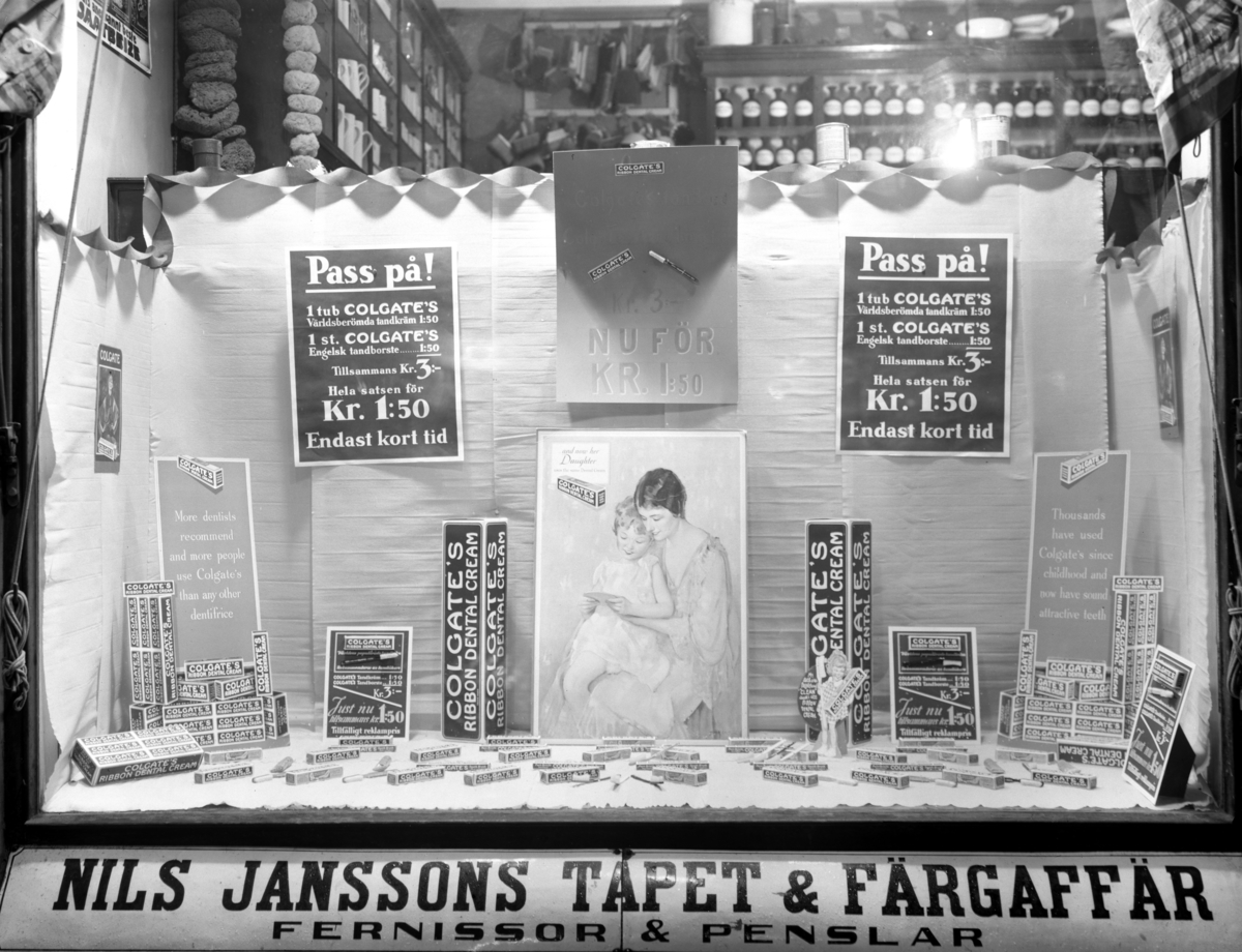 Tandkräm för hela slanten i skyltningen hos Nils Janssons färg på Järnvägsgatan 4. Bilden tagen runt 1930.