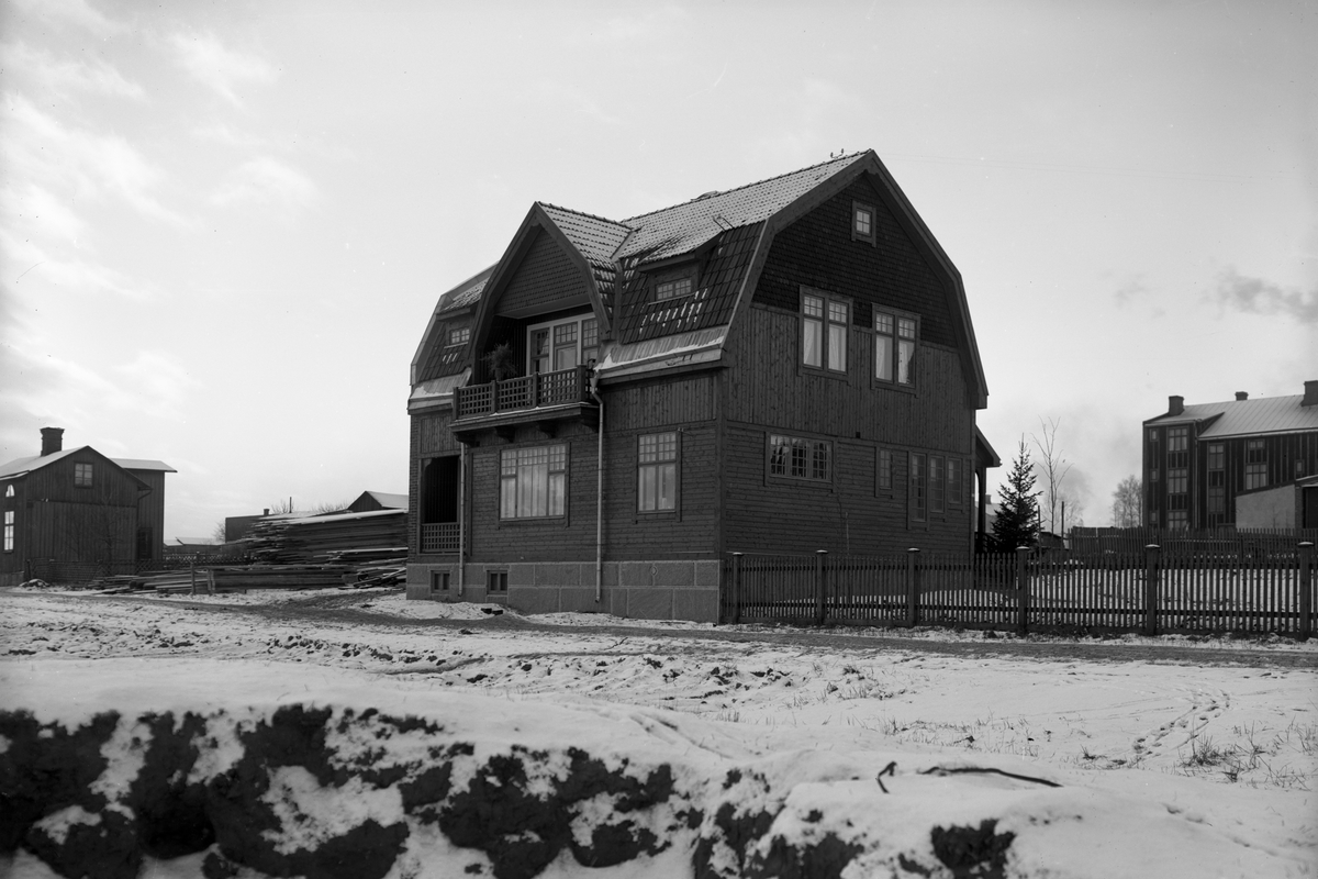 Nybyggd villa på John Ericssonsgatan 25. Bilden togs runt 1910. Huset till höger ligger på Långgatan.