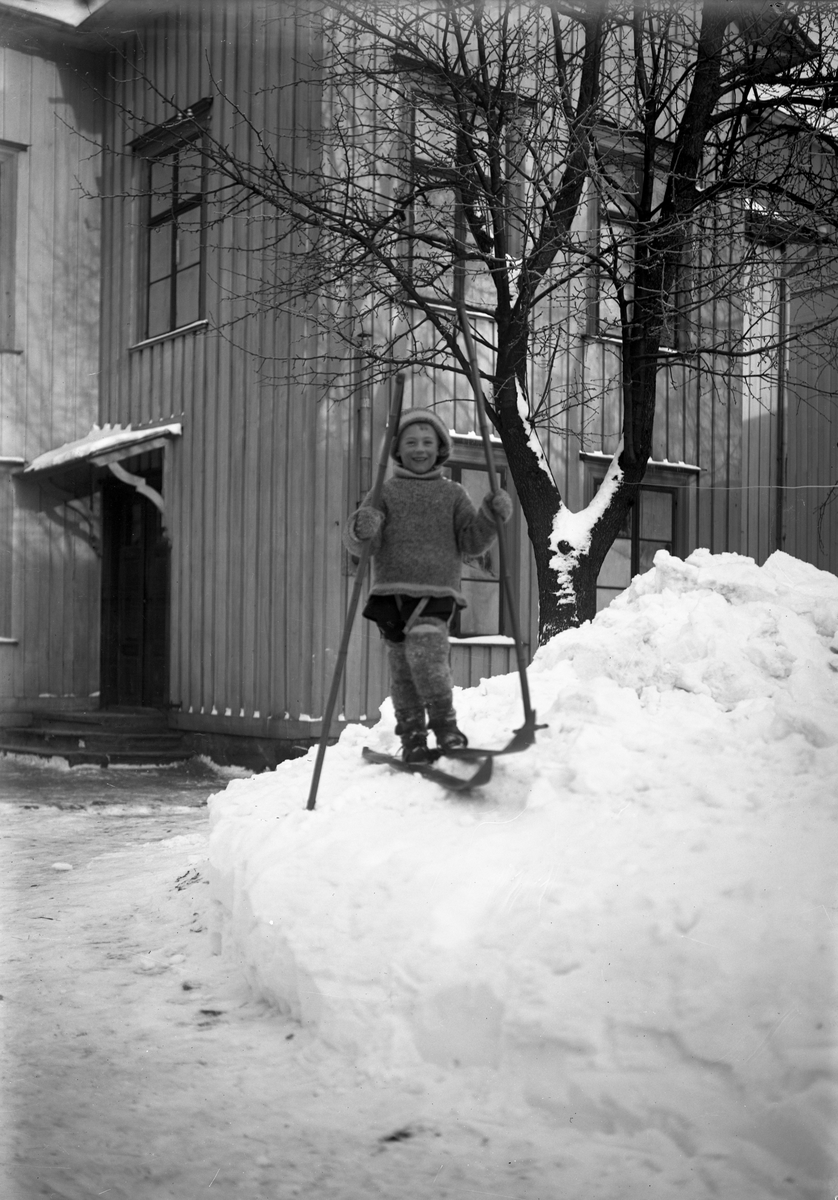 Pojke på skidor. Bilden togs troligen inne på fotografens gård på Södra Klaragatan 2.