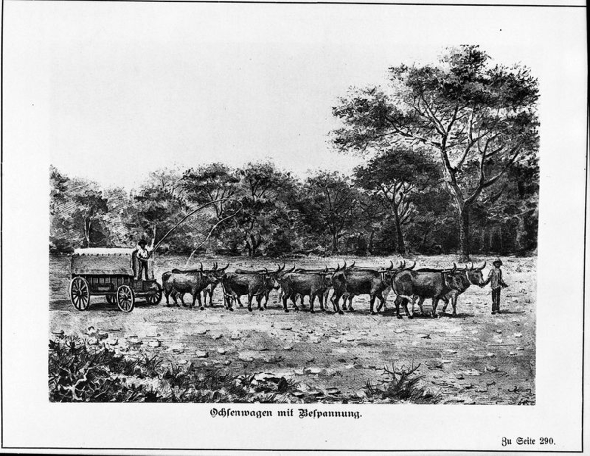 Illustrationer från Nama und Damara. Ochsenwagen mit Bespannung.
