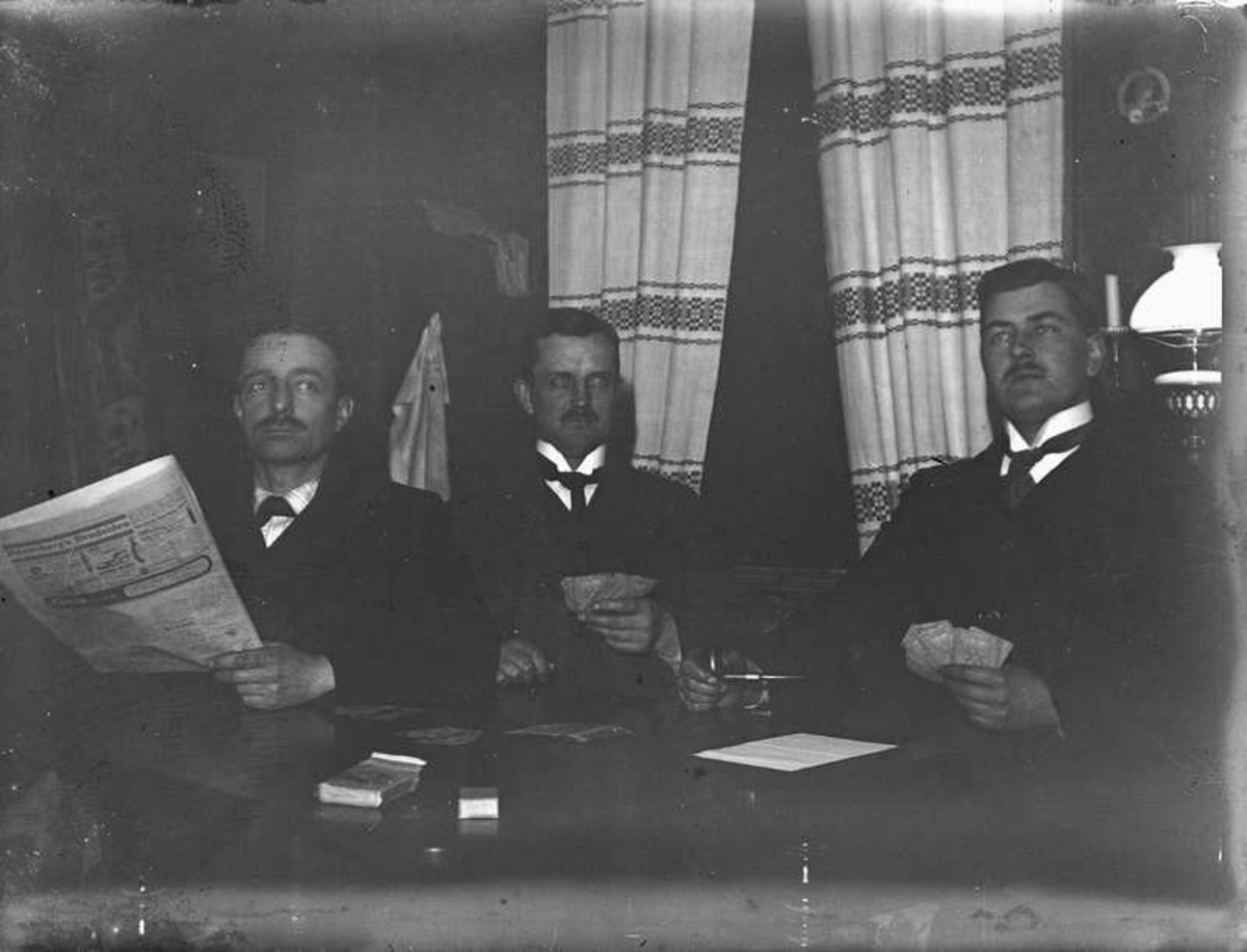 Tre okända herrar ägnar sig åt kortspel och tidningsläsning.