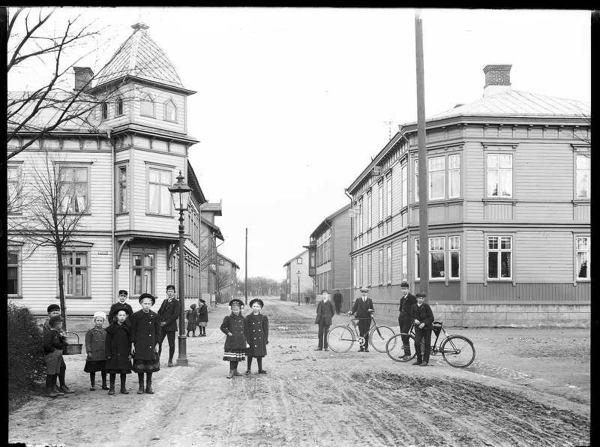 Flera barn och ungdomar, två med cykel, betraktar när fotot tas.