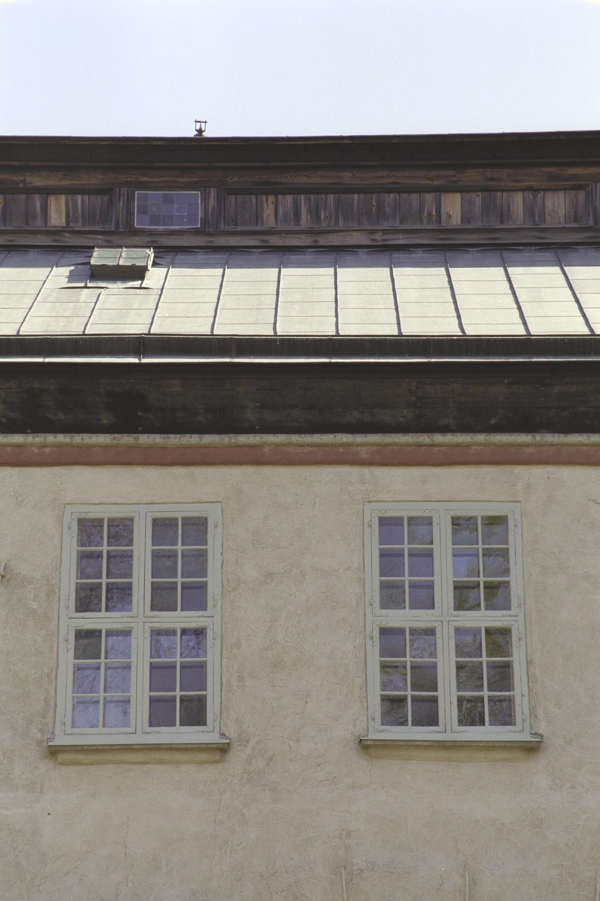 Huvudbyggnadens västra fasad, taket vid den femte och sjätte axeln från vänster.