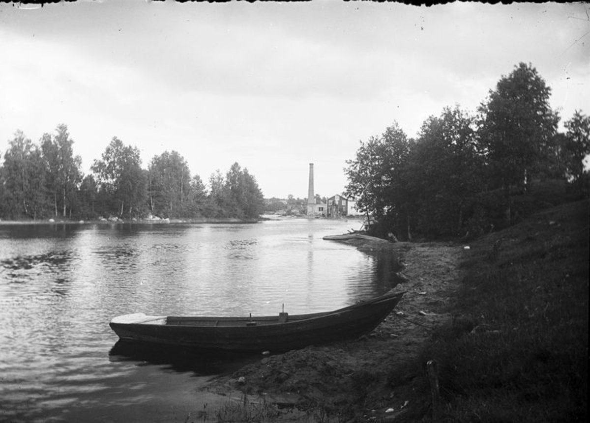 Å med båt, i bakgrunden industri