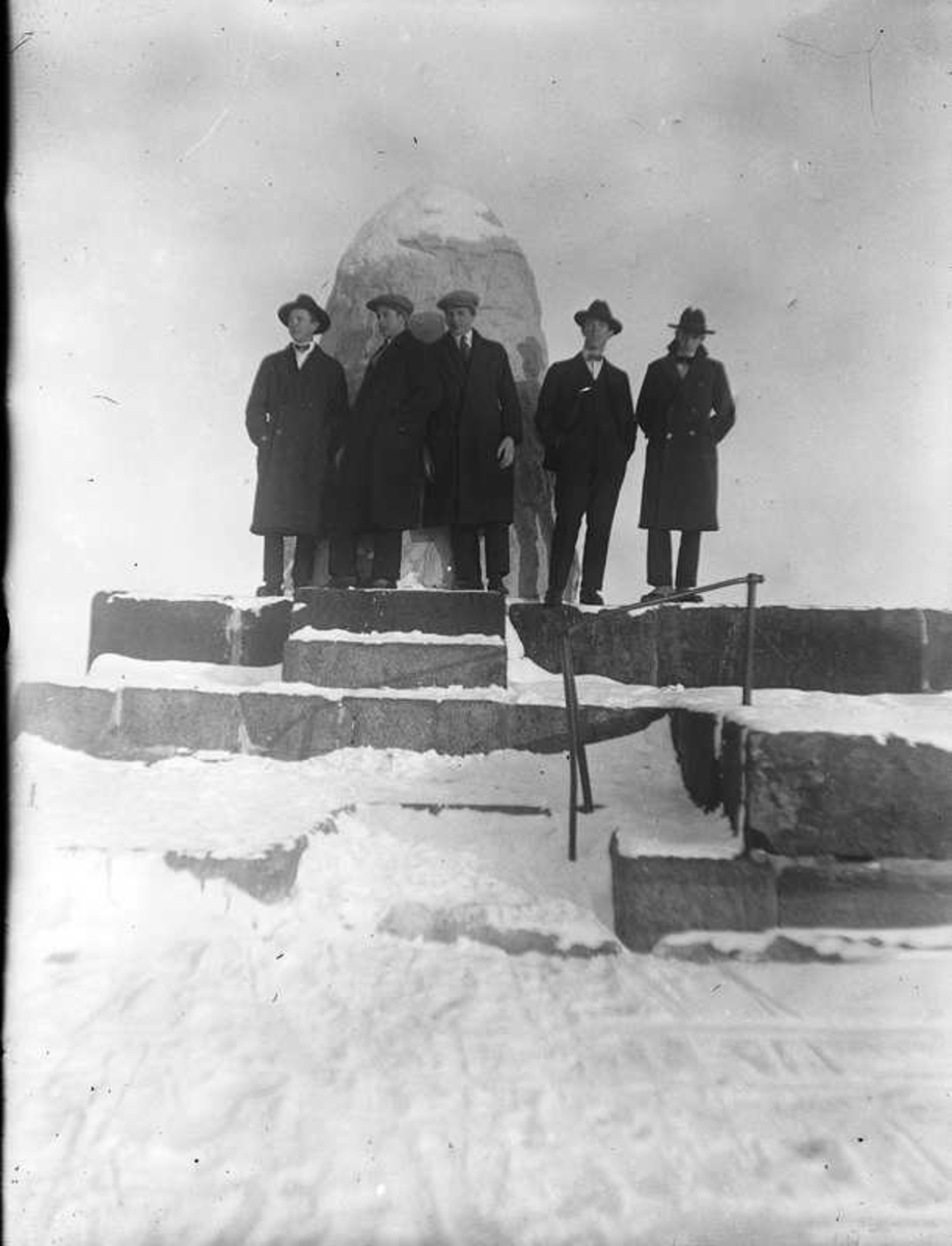5 herrar vid ett landmärke. [vågbrytare vid Vänersborg?]