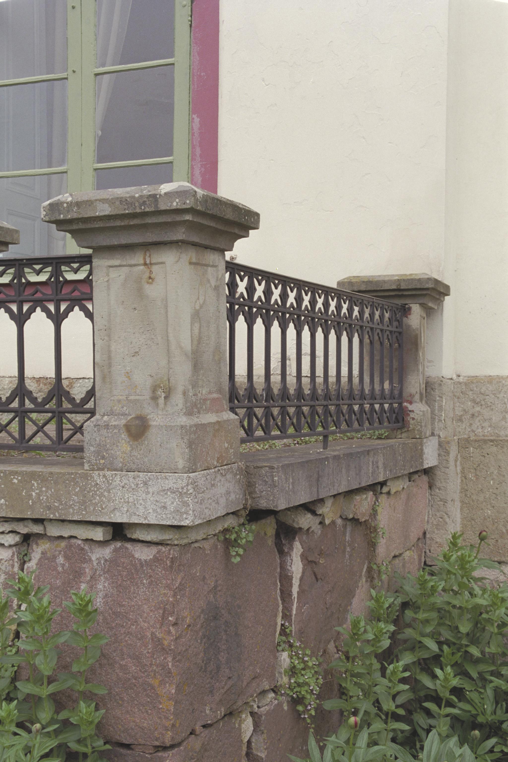 Huvudbyggnadens östra fasad, postamentet i nordöstra hörnet.
