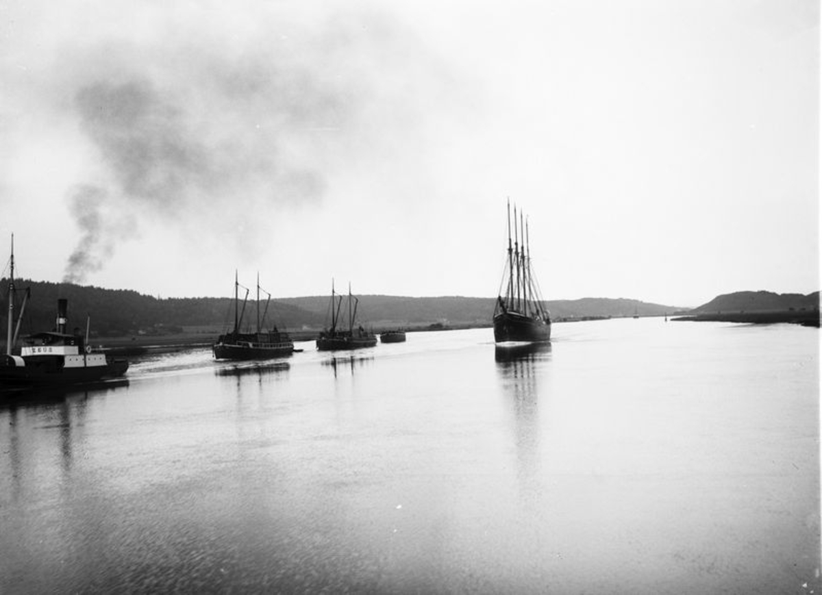Göta älv? med fartyg. Ångare bogserar pråmar
