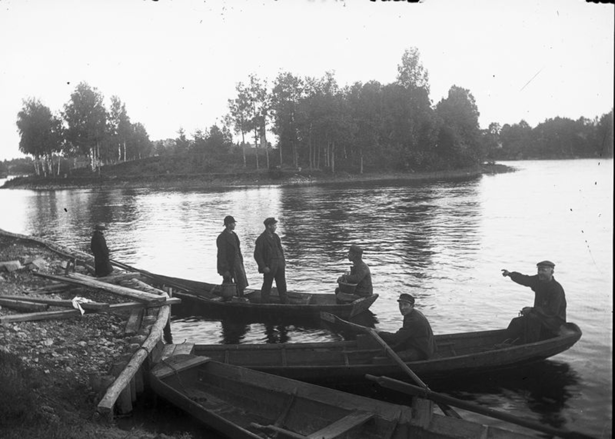Män i två båtar i sjö med holme med monument på.