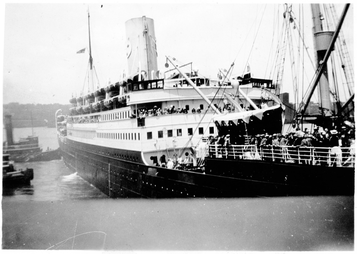 Båtresan till USA. S/S Drottningholm lägger ut från hamnen. Hugo Tibblins samling