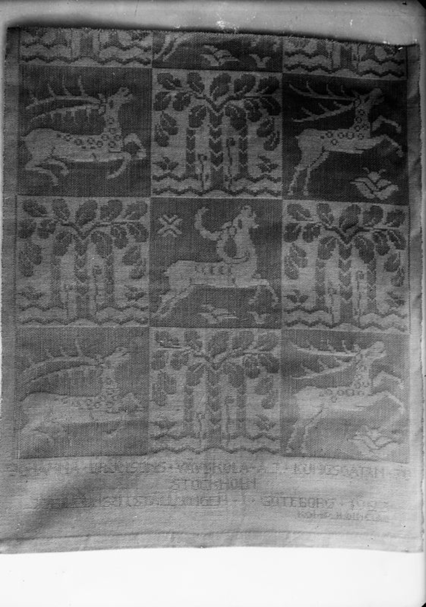 Vävnad med invävd text Johanna Brunssons Vävskola AJ Kungsgatan 70 Stockholm Jubileumsutställningen i Göteborg 1923