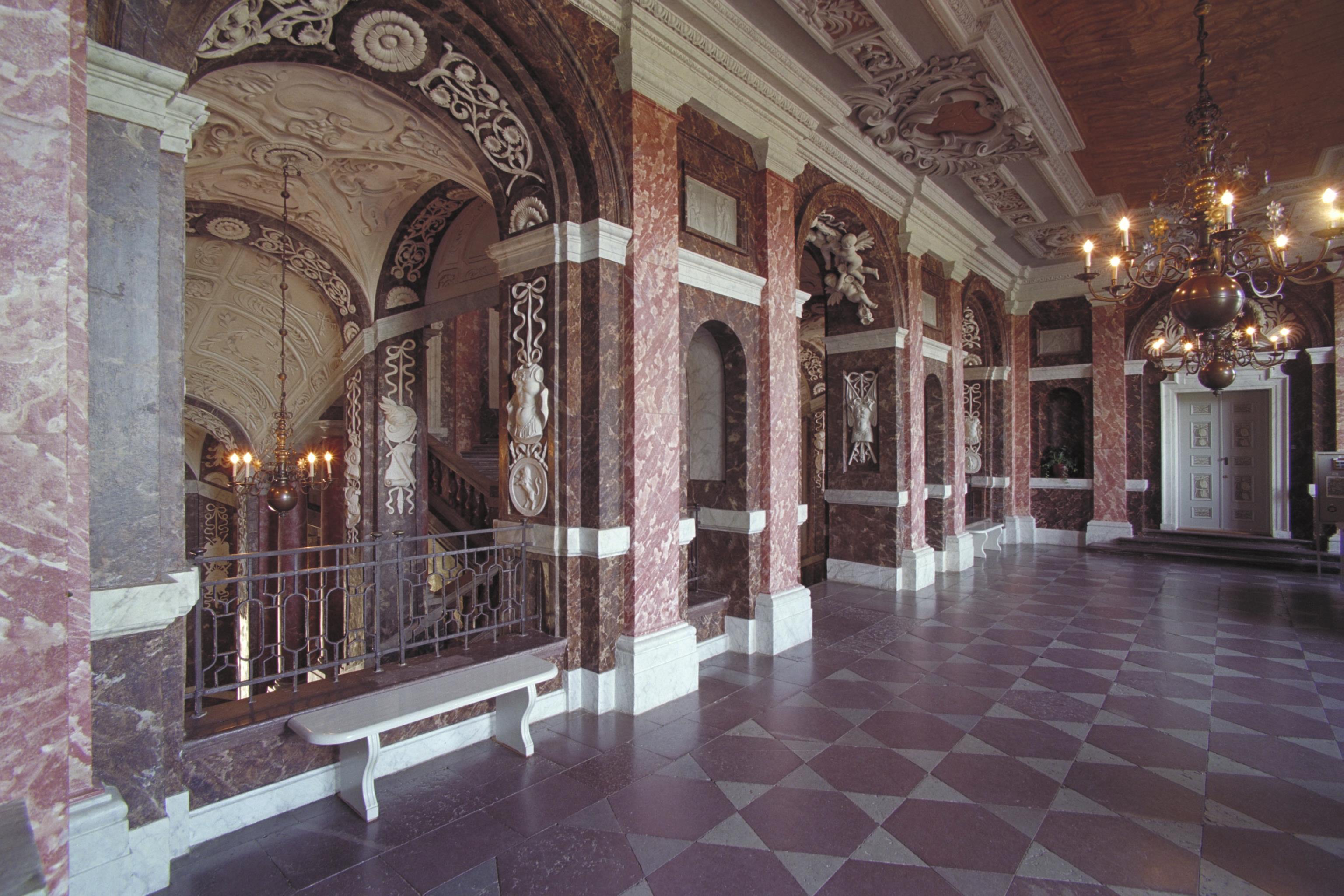 Slottets nedre vestibul med stuckaturer, bildhuggerier och plafonder.