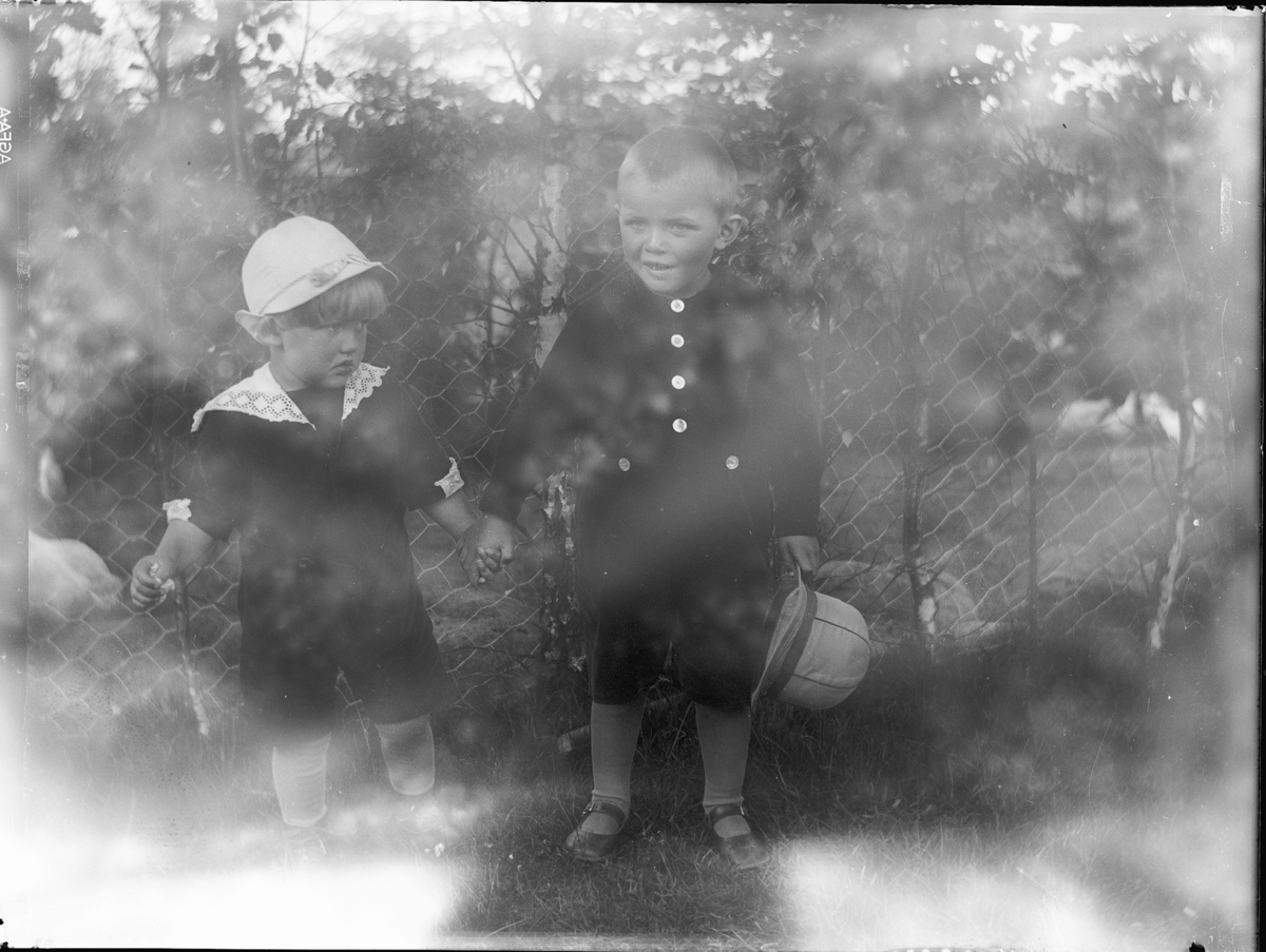 Två småpojkar vid ett gunnebostängsel, i en trädgård.