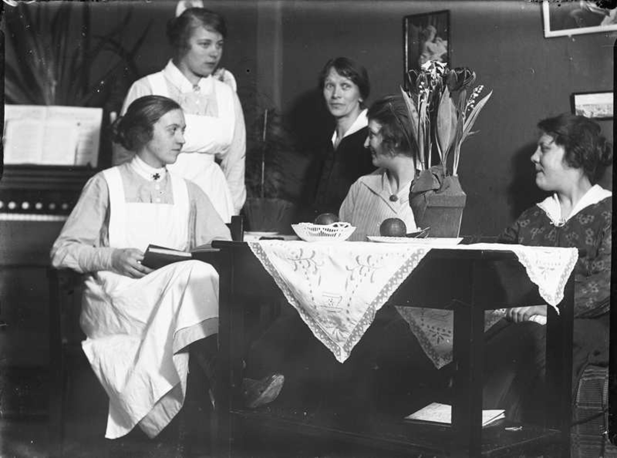 Fem kvinnor, två klädda i arbetskläder (sjuksystrar?)