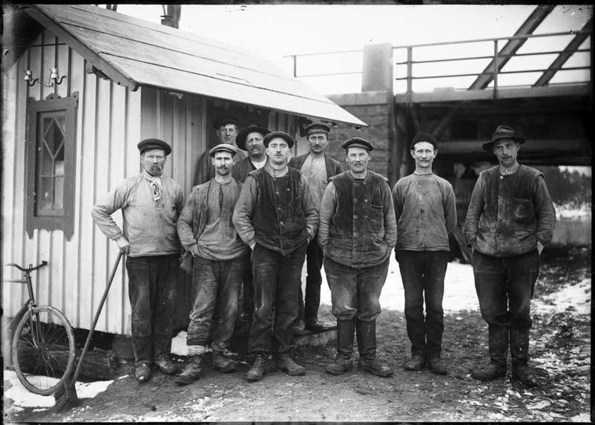 En grupp arbetsklädda män vid okänd bro.