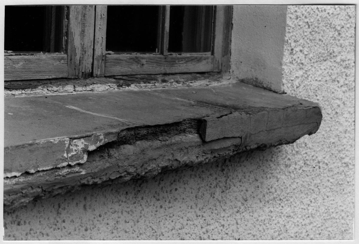 Skölvene sn, Skölvene kyrka, Fönsterdetaljer: uttjärnt kittning, måleri och skadad solbänk. 1988-05-03