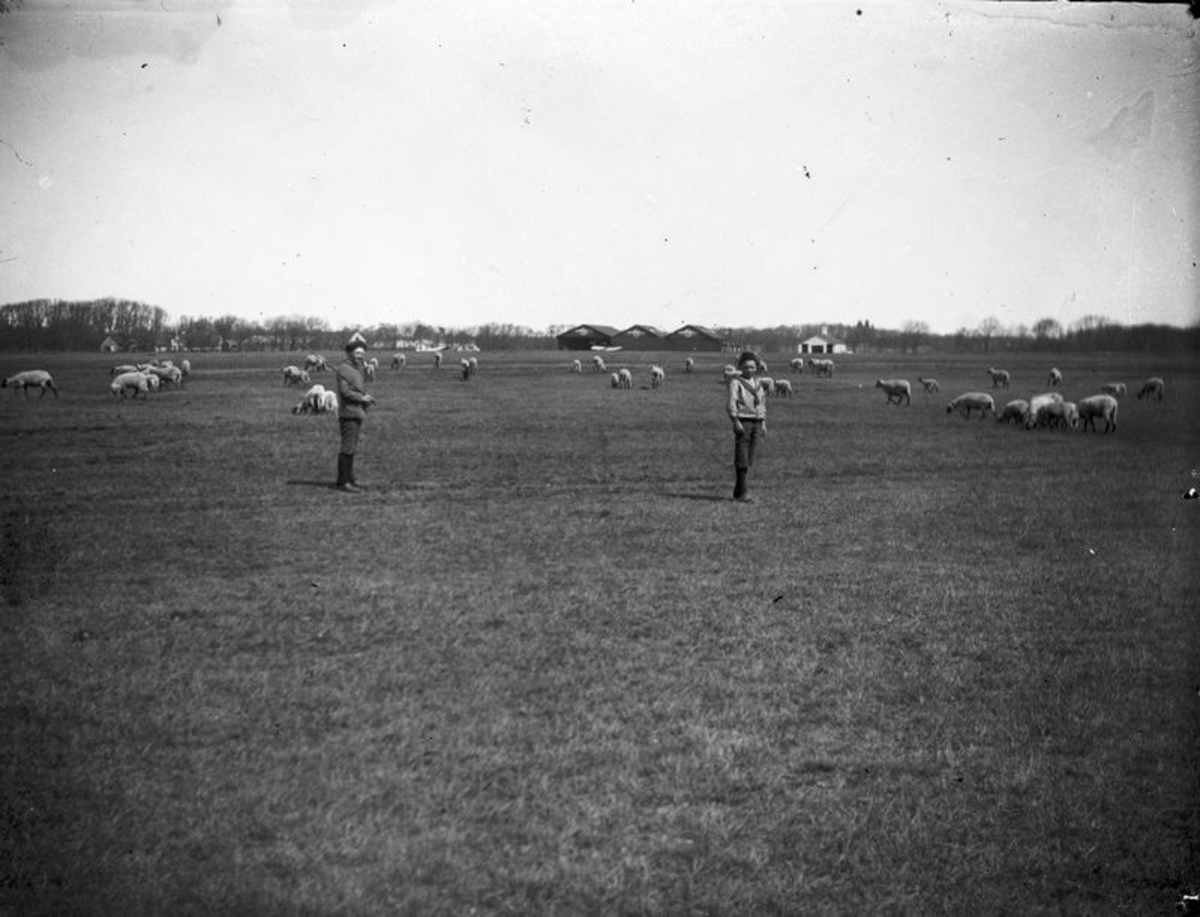 Fårvallning på flygfältet, hangarer i bakgrunden