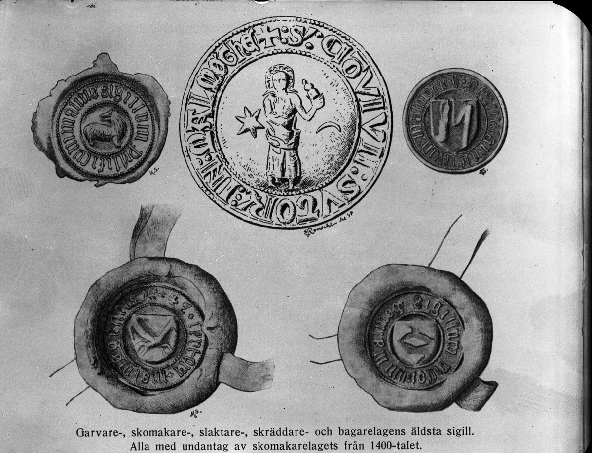 Sigill Garvare, skomakare, slaktare, skräddare och bagarelagens äldsta sigill.