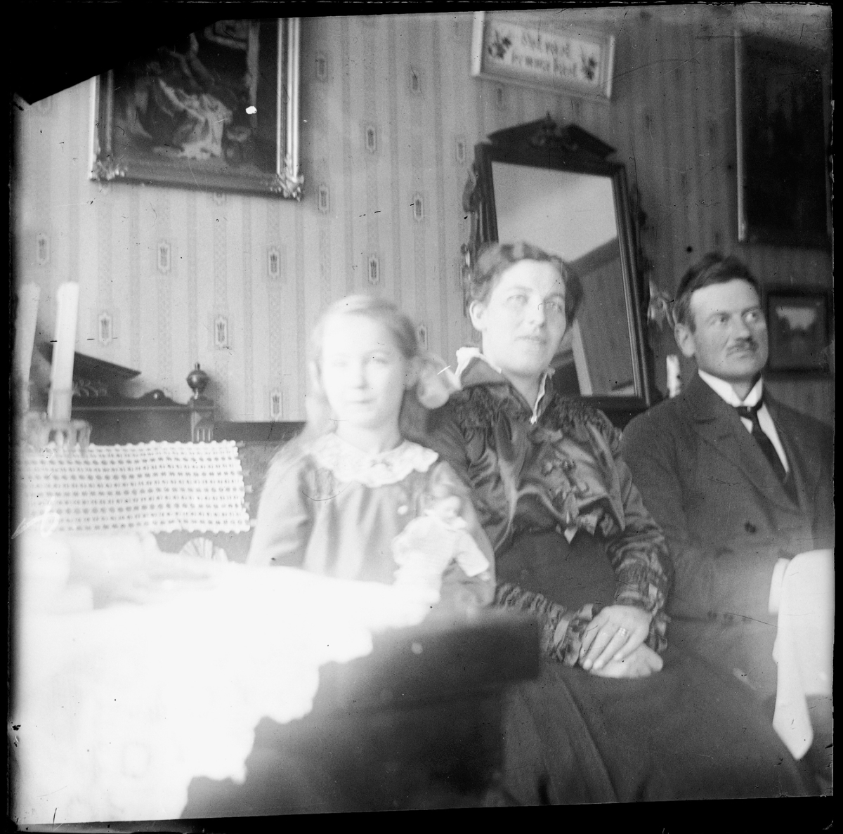 Bild från morbror Oskar och moster Mia Norstedts besök i Göteborg för att hämta kusin Elsa: Morbror, moster och Elsa vid frukostbordet. Wadmansgatan 10 Göteborg.