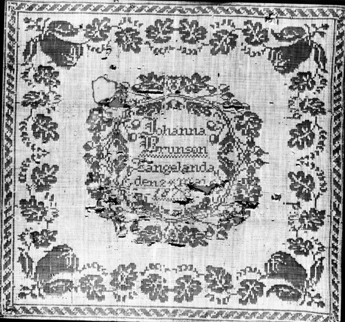 Vävnad med invävd text Johanna Brunsson Tångelanda 1873