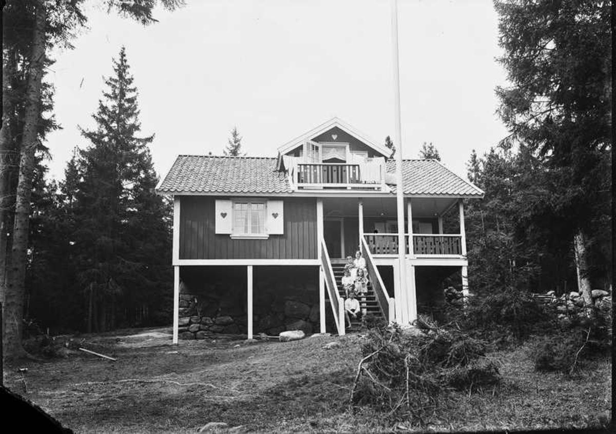 Fem personer på en trappan till en stuga.