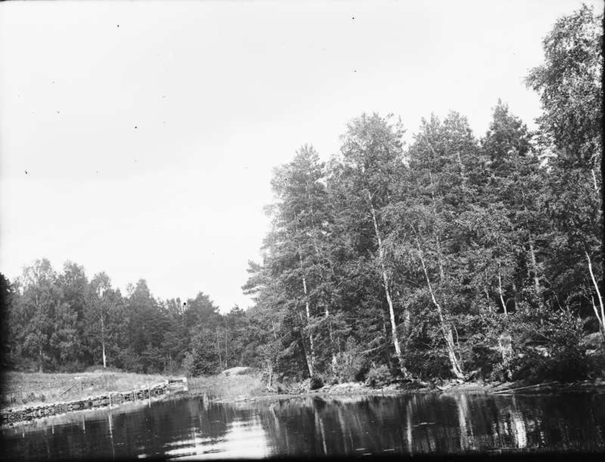 Vy över vatten, ena sjökanten är stenlagd.
