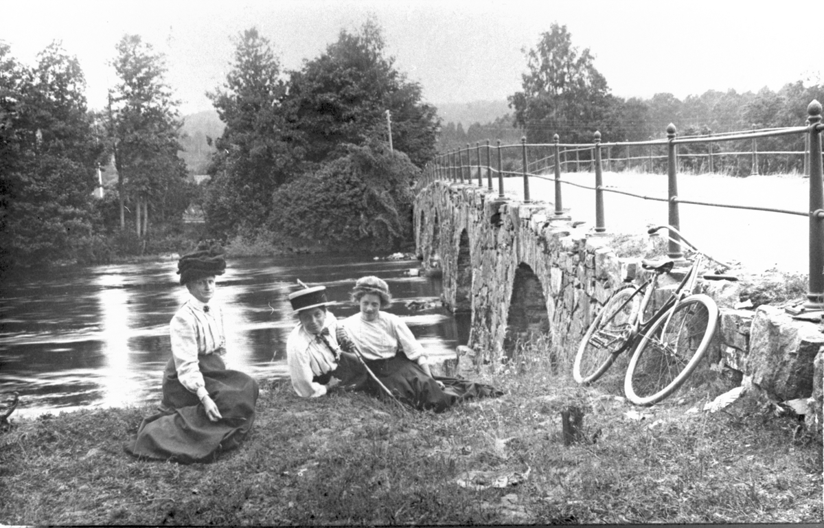 Kvinnor på cykeltur vilar i gröngräset vid vattnet.