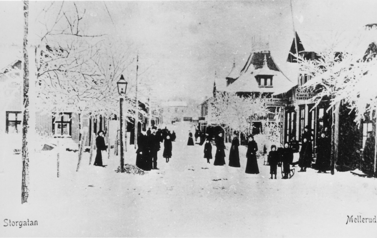 Storgatan i Mellerud. Första gatlyktan är uppsatt.