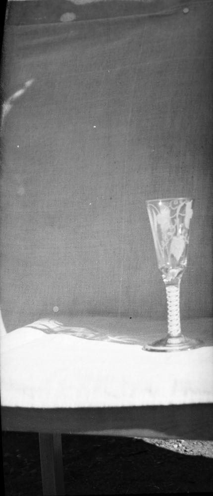 Snapsglas, vit spiral i foten, etsning: såg och vinlöv. Vänersborgs Museum