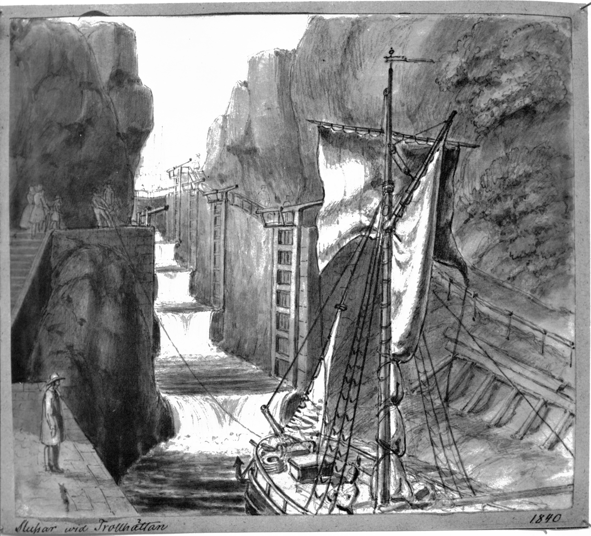 Slupar vid Trollhättan i 1800-års slussled.Tuschteckning av L W Kylberg 1840 (Nationalmuseum)