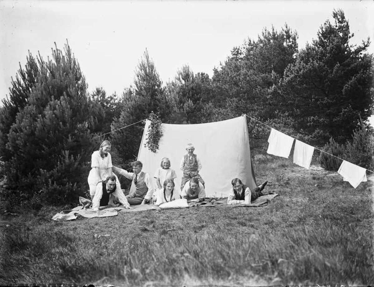 Åtta personer vid ett tält.