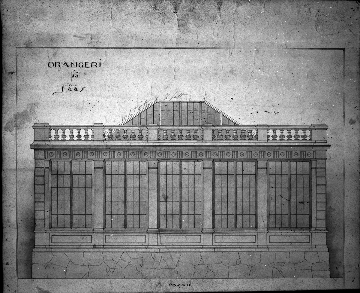 Akvarellerad tusch ritning. Orangerie på Nääs - fasad -.