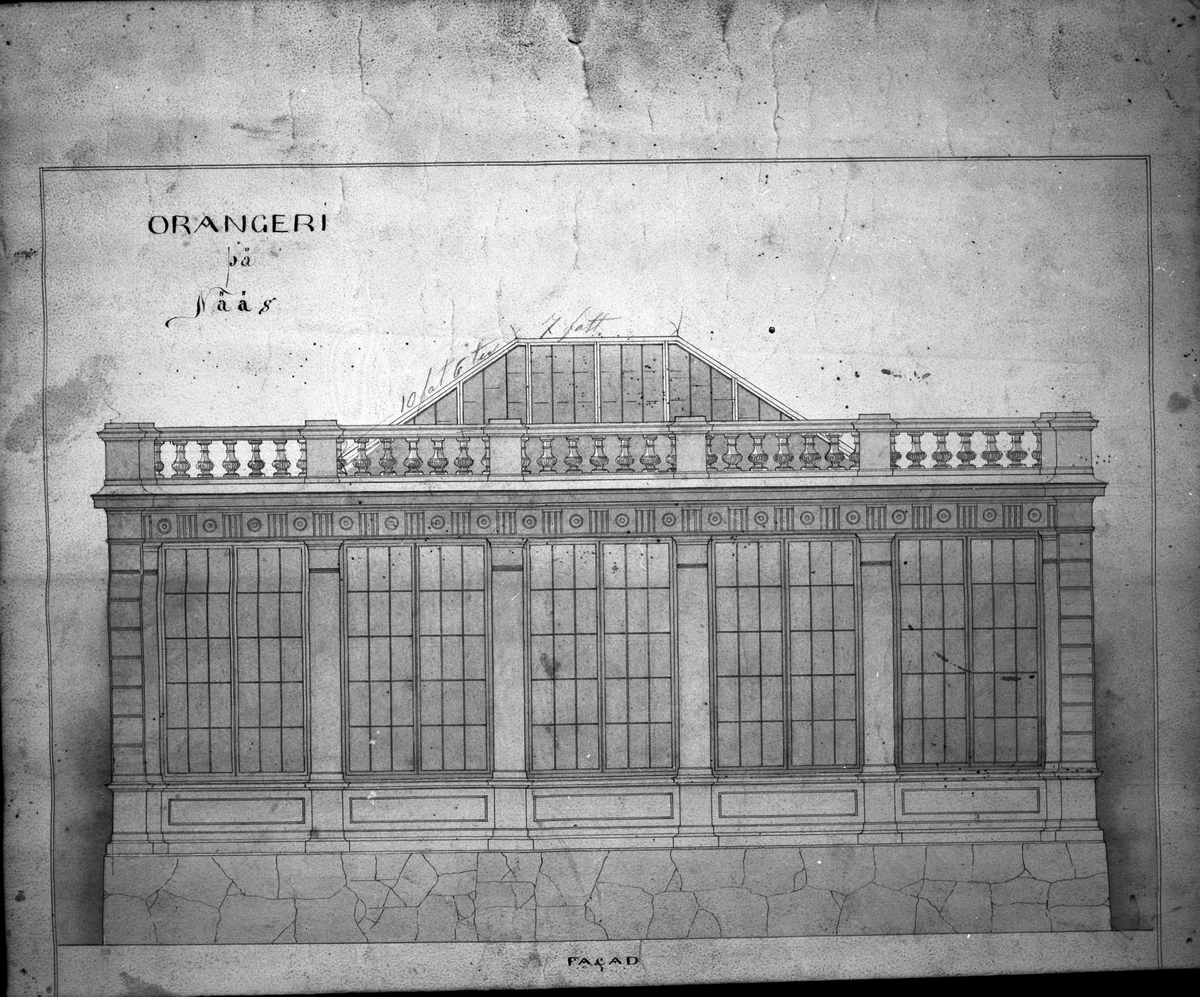 Akvarellerad tusch ritning. Orangerie på Nääs - fasad -.