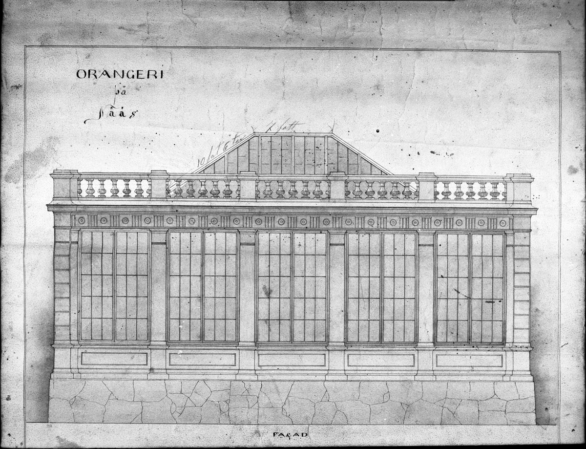 Akvarellerad tusch ritning. Orangerie på Nääs - fasad -.