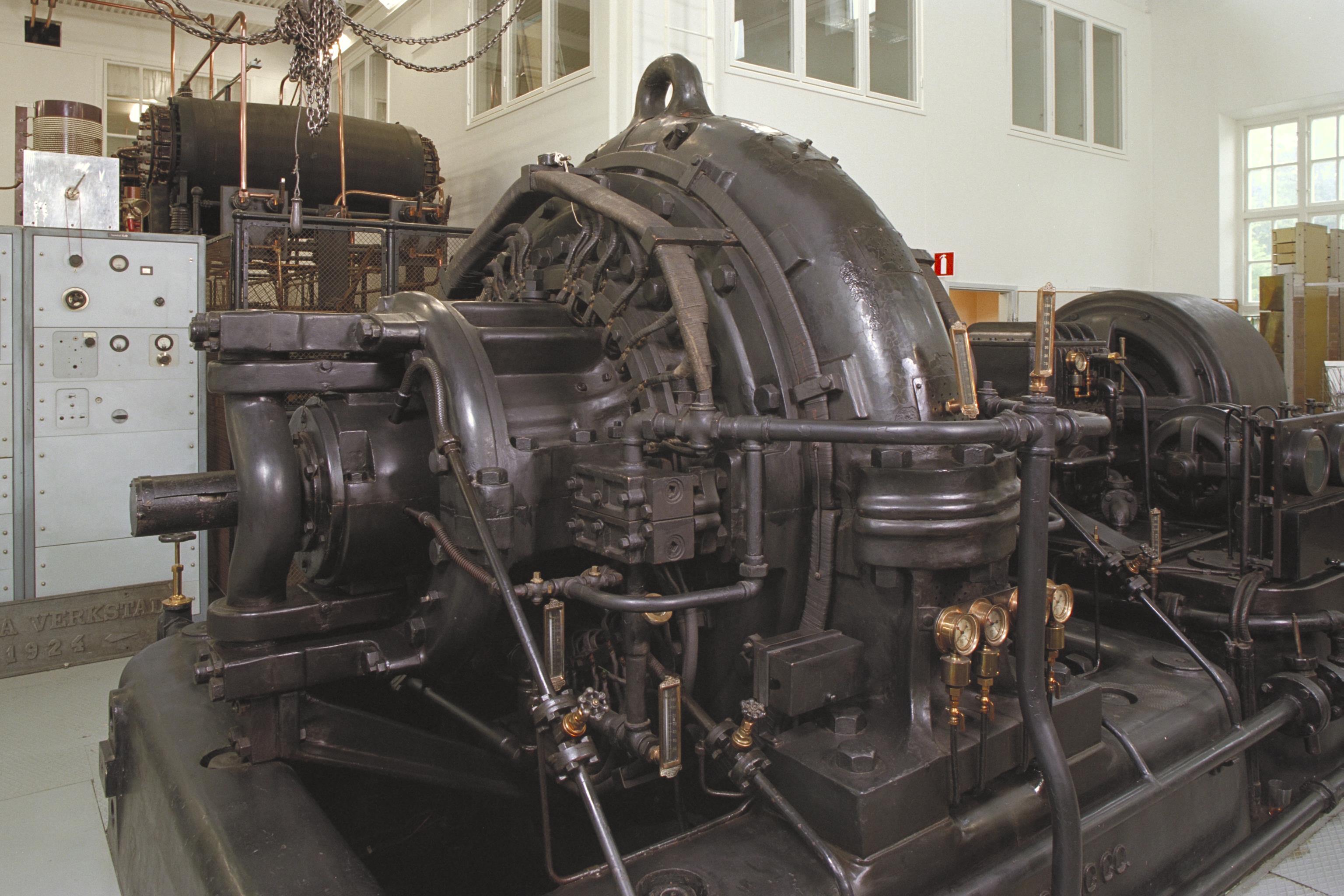 200 kW långvågssändare sedd från sidan. I bakgrunden antennavstämningsutrustning. Iförgrunden rör för smörjning av generatorns lager samt rör för vattenkylning.