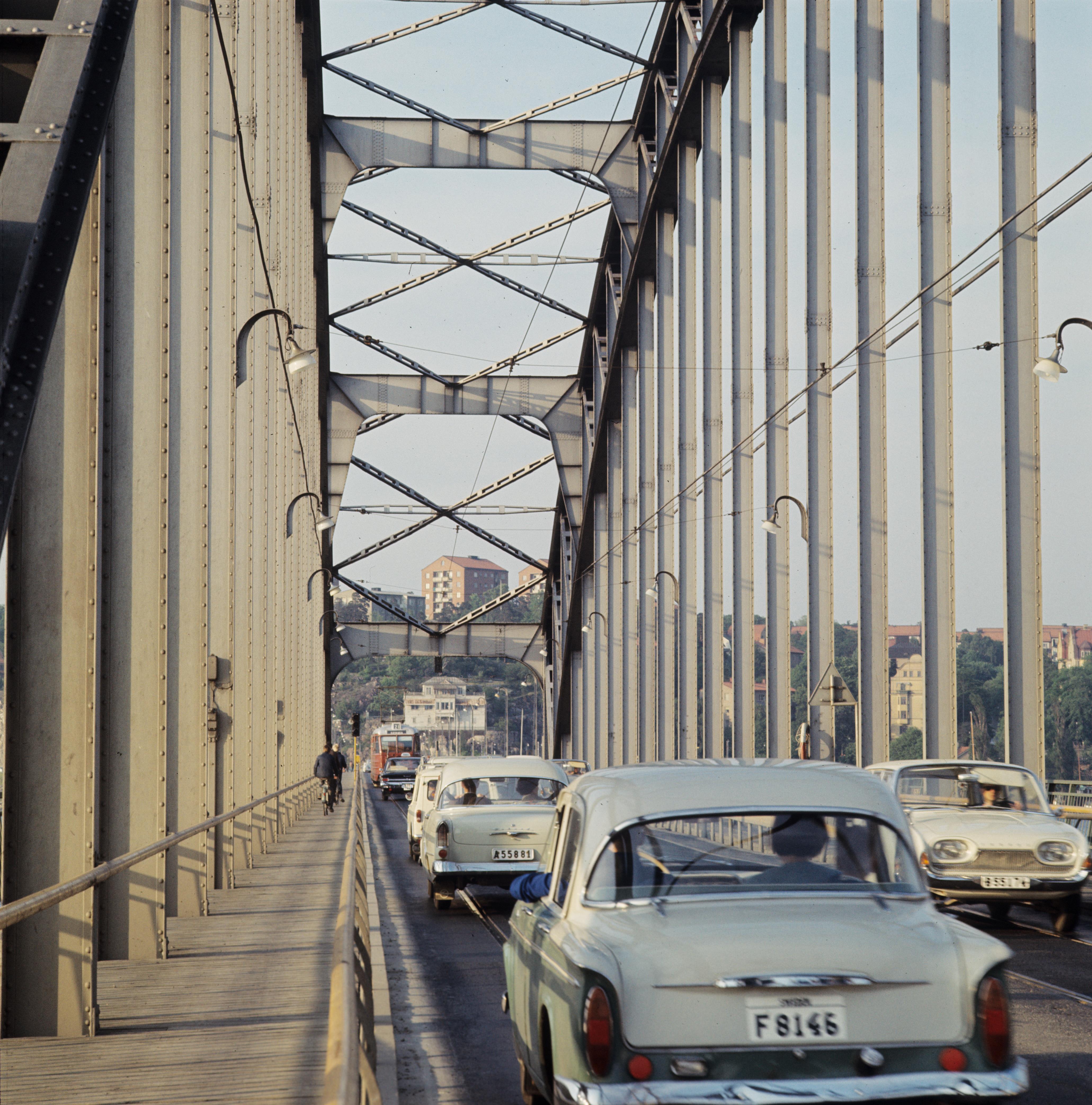 Tät trafik på Lidingöbron. Bilden troligen från slutet av 1960-talet/början av 1970-talet.