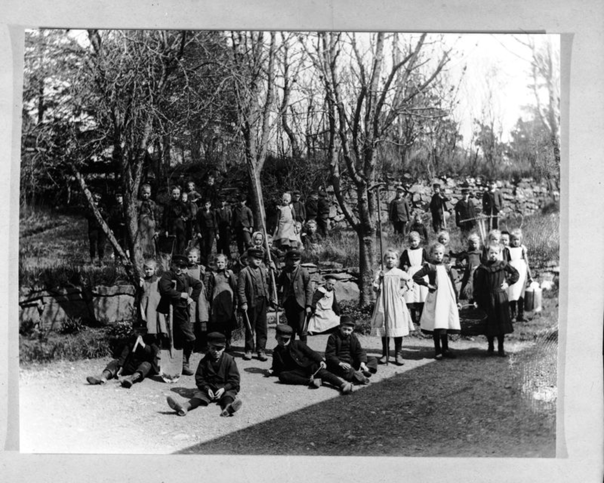 Anders Johanssons fotosamling: Skolbarn med verktyg för trädgårdsskötsel Främmestad.