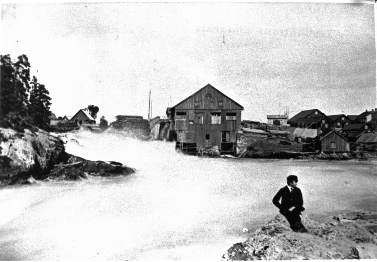 Gullöfors med sågaran på Malgön som bakgrund. Trollhättan