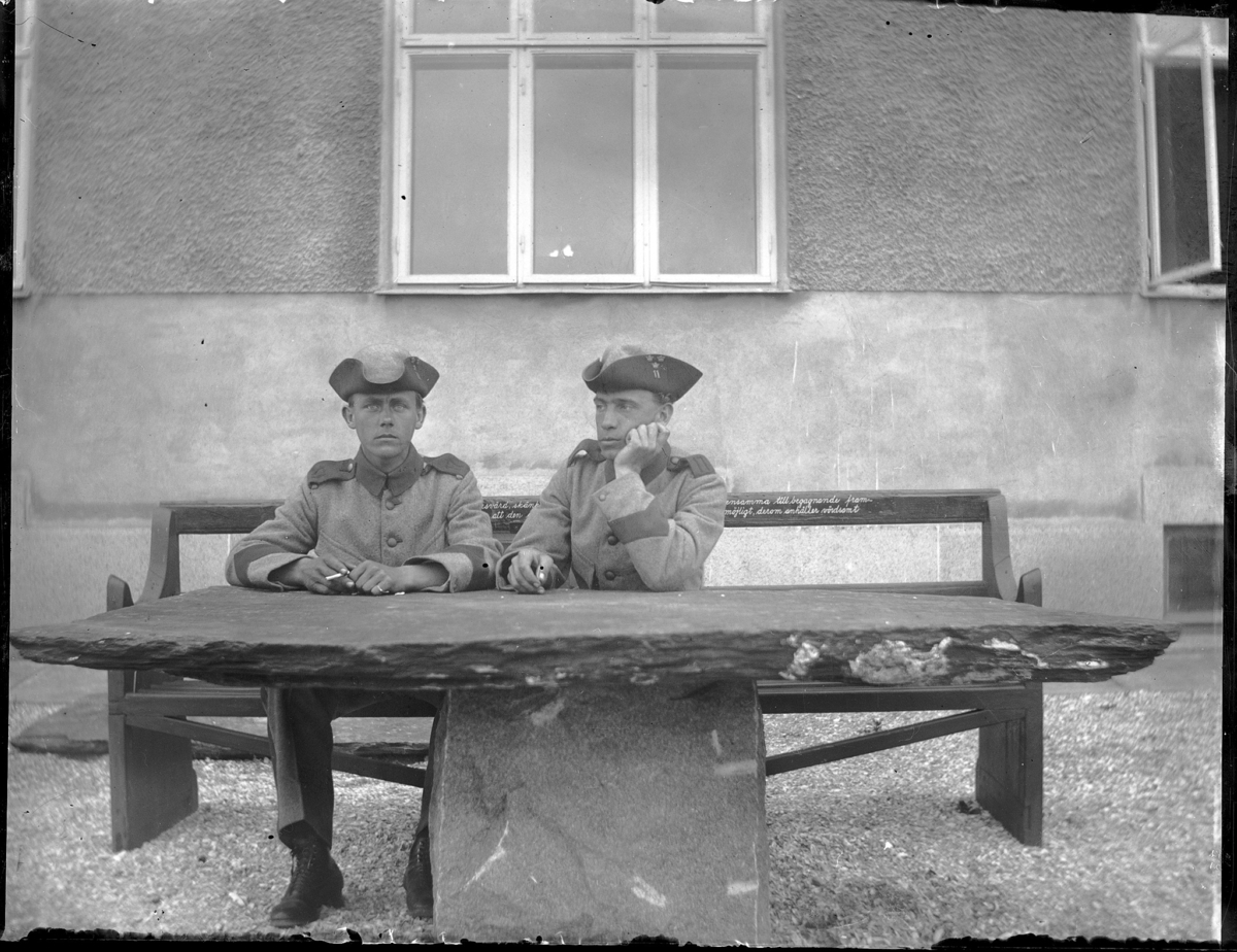 Två beväringskamrater sittande vid ett trädgårdsbord.