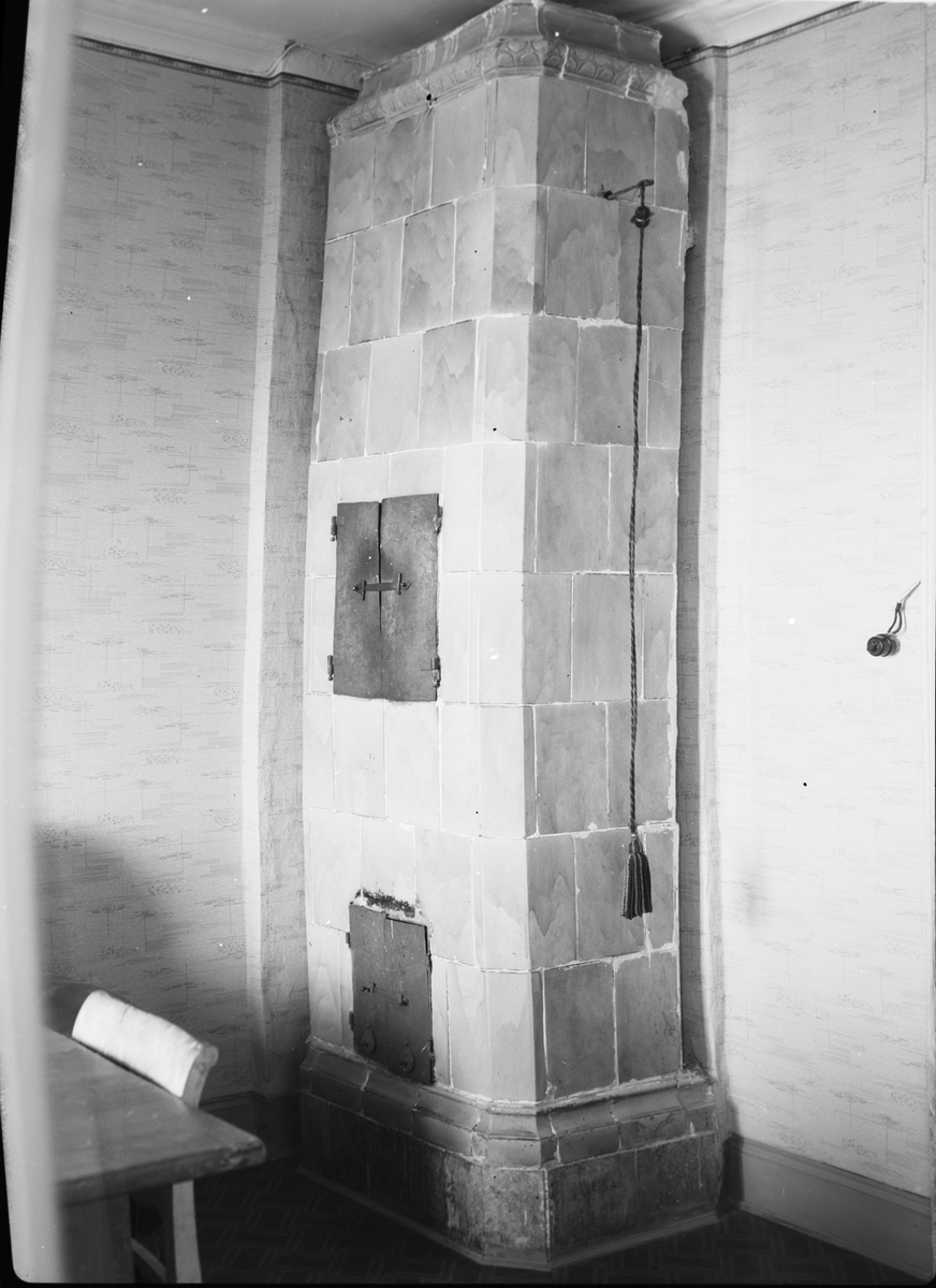 Järnkamin. b Kamin med kakelugn. c-g Kakelugn. Alltorps tingshus Ödskölt