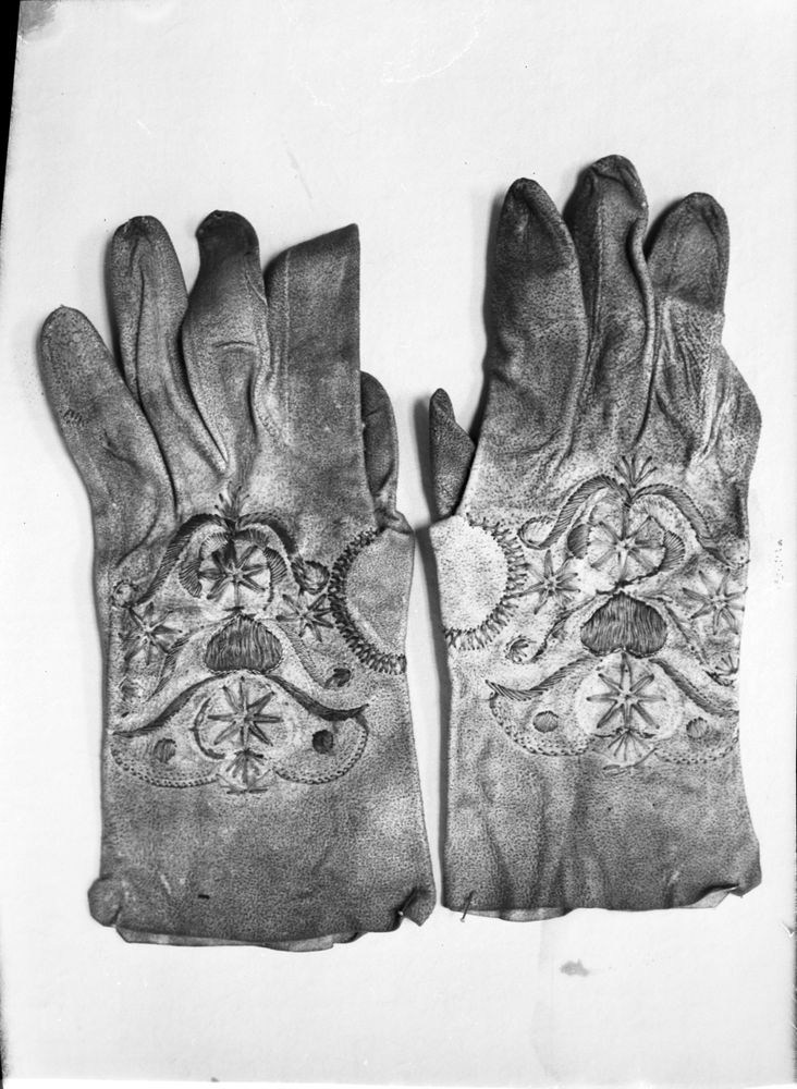 Dräktskick. Handskar, gula av skinn och broderade. Vänersborgs Museum