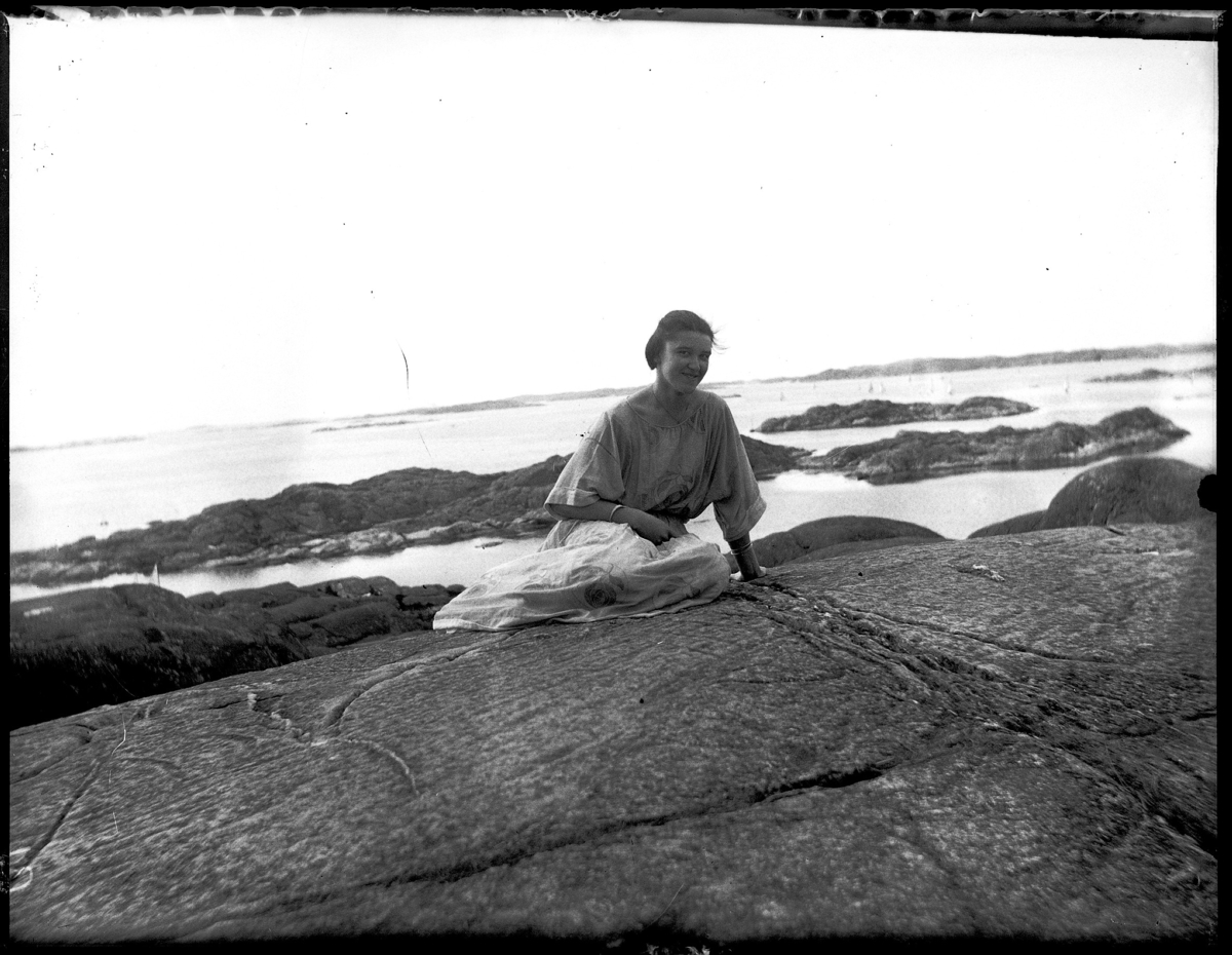 Saltholmen. Arne Sernströms väninna, sittande på klipporna.