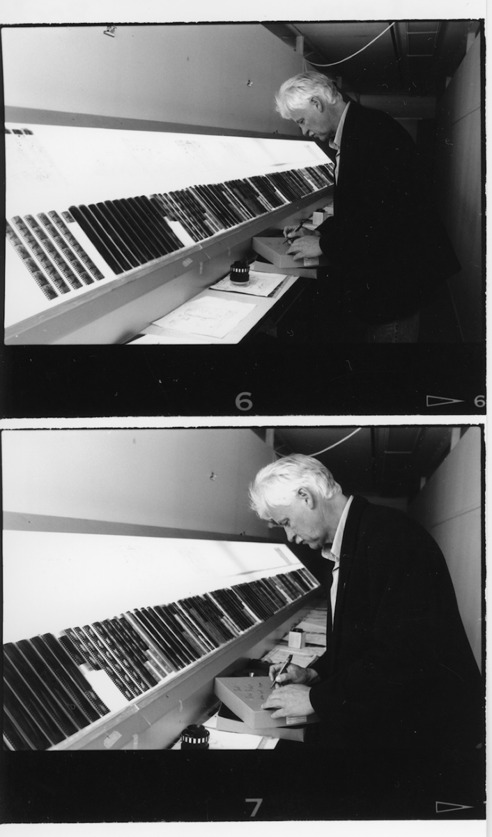 Lennart Brundin, Haléns postorder, Borås. Han står vid ett ljusbord med fotonegativ.