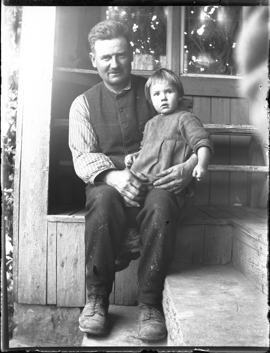 Morbror Oskar i arbetskläder med Inga-Lisa i knät.