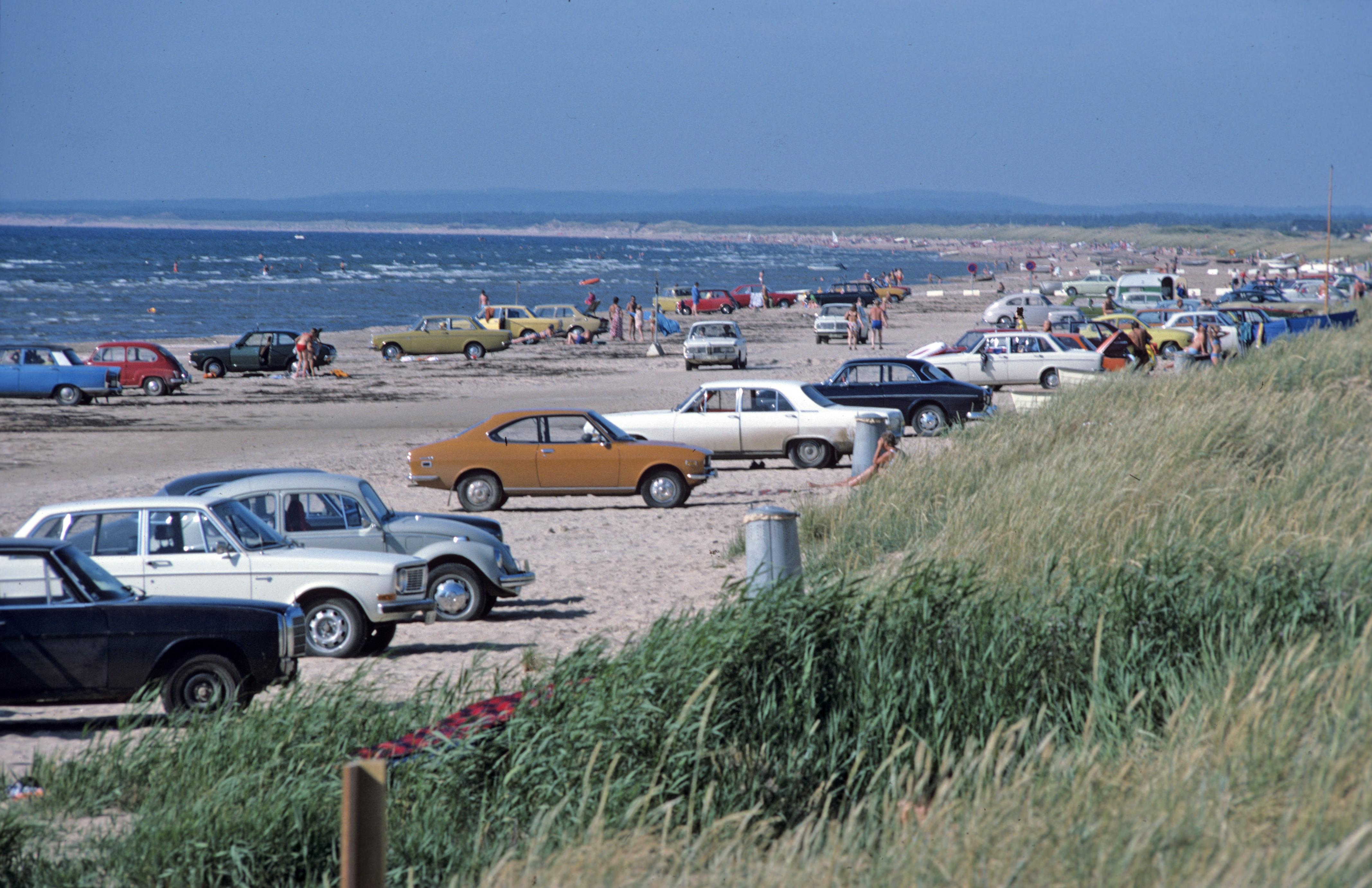 Beskrivning: Bilar parkerade på stranden. Bilden troligen från mitten av 1970-talet.