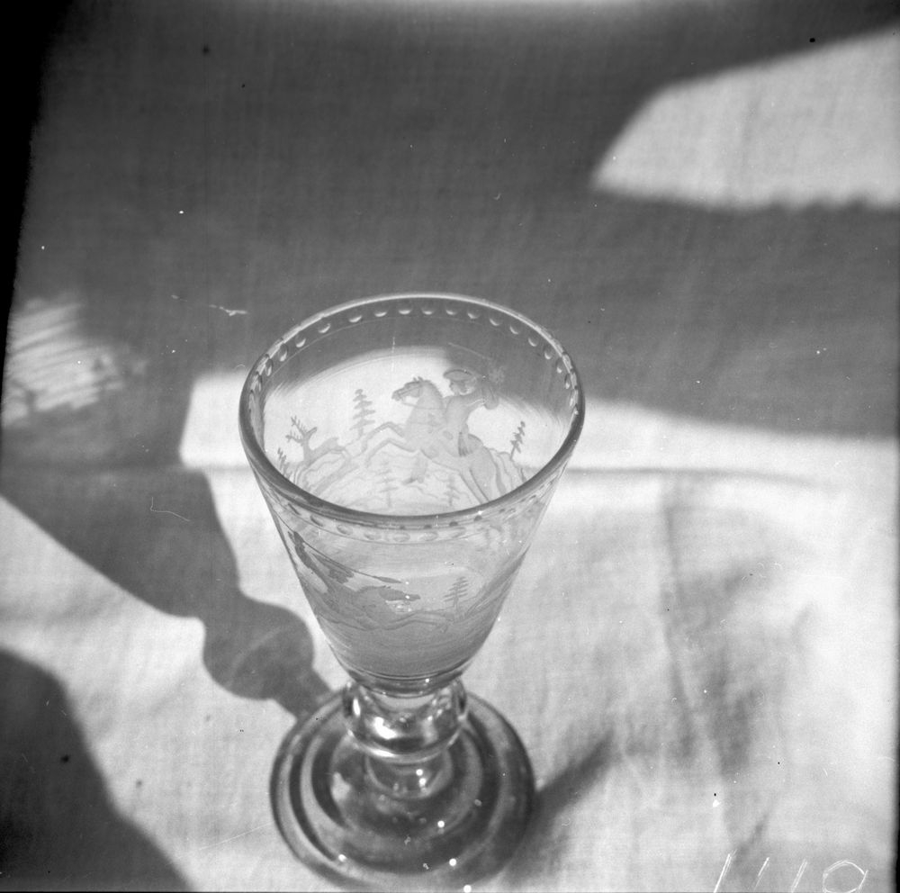 Glassamlingen. Vinglas, svagt massiv fot, slipad pärlstav upptill. Vänersborgs Museum